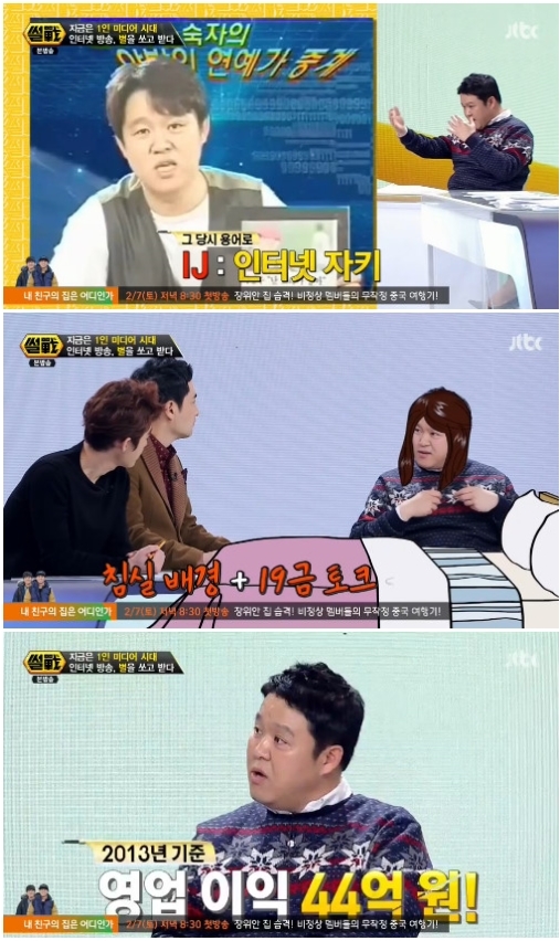 이날 주제는 아프리카TV, 유튜브 등 최근 각광받고 있는 1인 미디어채널들로, 김구라는 "그 당시에는 성인 코드가 접목되서 침실 배경에 19금 토크였다. 수익구조는 지금과 달랐다. 사용자가 월 가입비를 내는 구조였다"며 "아프리카 TV가 지난해 상장했는데 순이익이 44억원 대"라고 말했다.