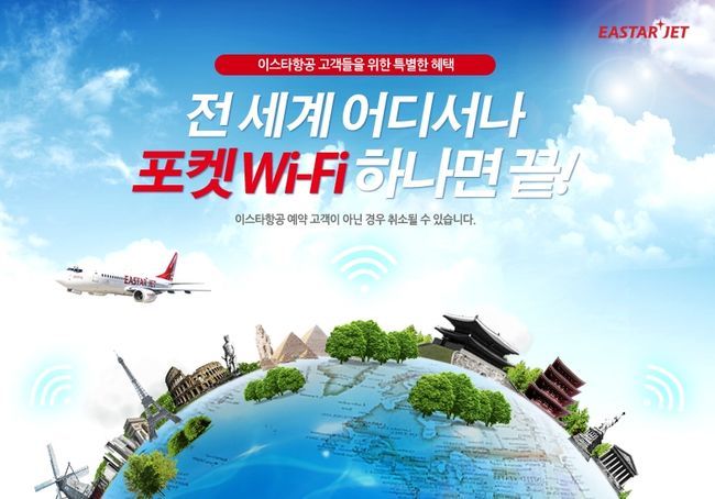 이스타항공(www.eastarjet.com)이 회원 및 예약자를 대상으로 해외에서 이용 가능한 와이파이 서비스를 할인 제공한다.