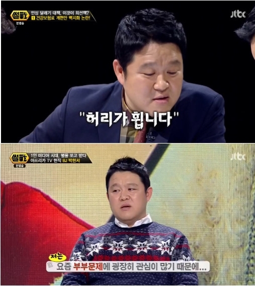 1인 미디어채널을 주제로 한 '예능심판자' 코너에선 "부부 문제에 관심이 많다"고 말했다. 앞서 그가 넌지시 밝혔듯 억대의 빚은 아내가 친인척의 보증을 잘못 서면서 생겨났다. "(1인 미디어를 한다면)부부 상담으로 진출하고 싶다"는 그의 바람에서 고충을 짐작할 수 있었다.
