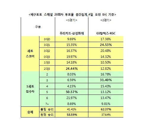 2014-2015시즌 V리그 대상 배구토토 스페셜 20회차 중간집계 결과