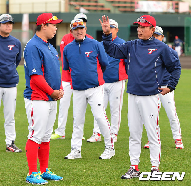 오키나와 캠프에 합류한 KIA 나지완이 김기태 감독과 대화를 나누고 있다.