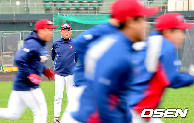 KIA 김기태 감독이 선수들의 달리기 훈련을 지켜보고 있다.
