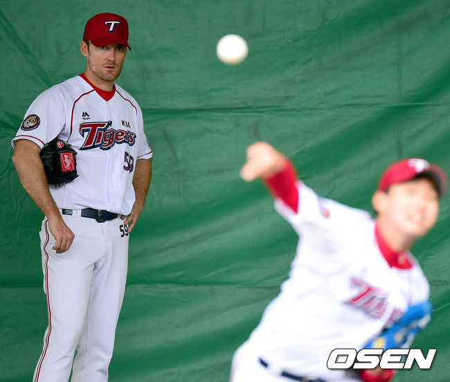 KIA 새 외국인투수 필립 험버가 팀 동료 홍건희의 투구를 바라보고 있다.