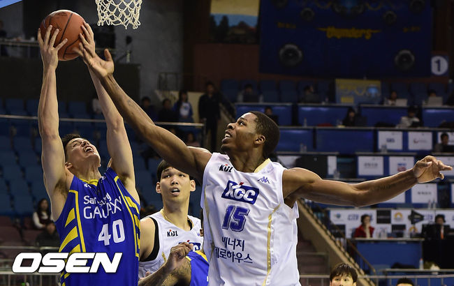 3쿼터 삼성 이동준과 KCC 심스가 리바운드 경쟁을 펼치고 있다.