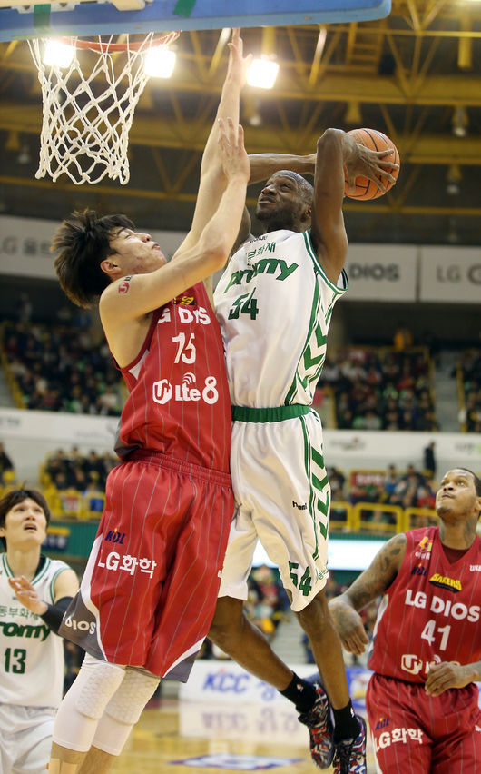활화산 같은 공격의 LG와 막강수비력의 동부산성이 정면으로 충돌했다. 동부는 30득점은 쉽게 넣는 데이본 제퍼슨을 어떻게 봉쇄할지가 관건이었다. LG는 김시래-유병훈-김영환-문태종-제퍼슨의 스몰라인업으로 나왔다. 동부는 김현중-허웅-김창모-윤호영-데이비드 사이먼이 베스트로 출동했다.