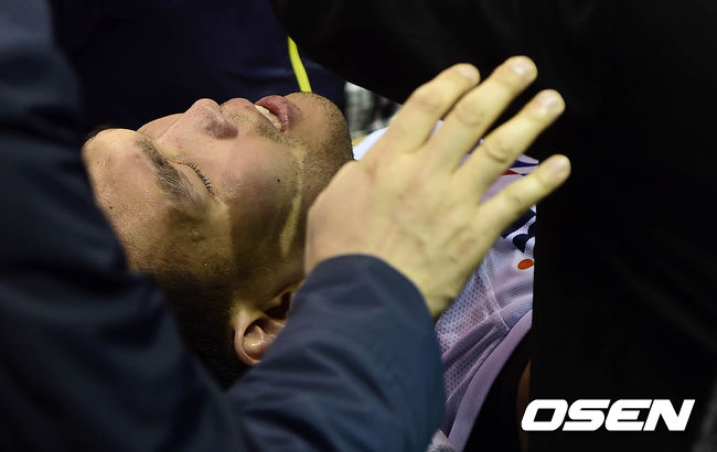 4쿼터 KCC 하승진이 라인을 벗어나는 공을 살려내려 시도하다 광고판을 넘어가며 쓰러져 실려가고 있다.