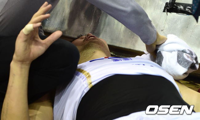 4쿼터 KCC 하승진이 라인을 벗어나는 공을 살리려 몸을 날리다 광고판을 넘어가며 쓰러져 일어나지 못하고 있다.