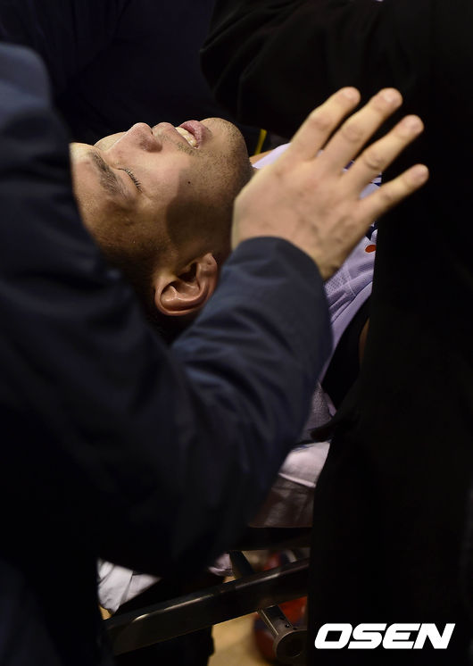 4쿼터 KCC 하승진이 라인을 벗어나는 공을 살리려다 펜스를 넘어가며 부상당해 일어나지 못해 들것에 실려나가고 있다.