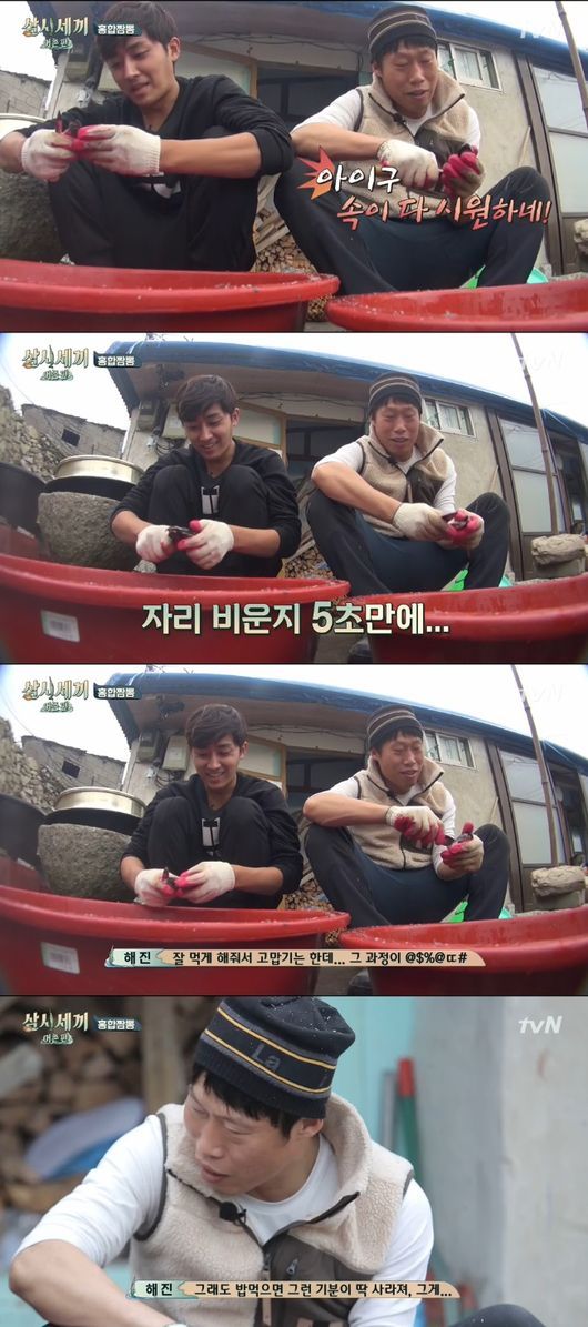 유해진은 자리로 다시 돌아오더니 "속 시원하다"며 "여기 저기 피곤하다. 잘 먹게 해줘서 고맙긴 한데 과정이"라고 말을 잇지 못했다.
