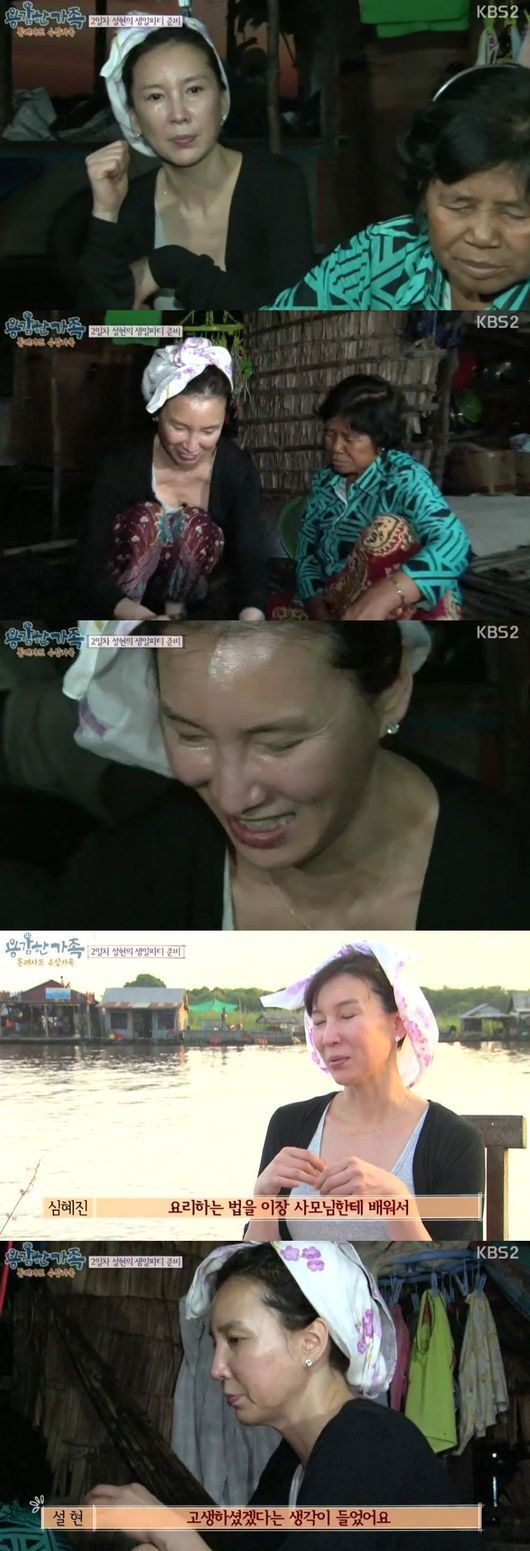 6일 방송된 KBS '용감한 가족'에서는 막내 설현의 생일이 그려졌다. 심혜진은 설현이 생선을 잘 먹던 것을 기억하고 생선을 준비하려 한다. 심혜진은 가족들과 회의를 하며 "엄마가 있는 것으로 돈을 바꿔서 생선을 사올 테니까 불 피우고 있으라"고 안심시킨 뒤 이장댁을 찾았다. 심혜진은 자신의 안마기를 팔고 메기를 구해 손질에 들어갔다.