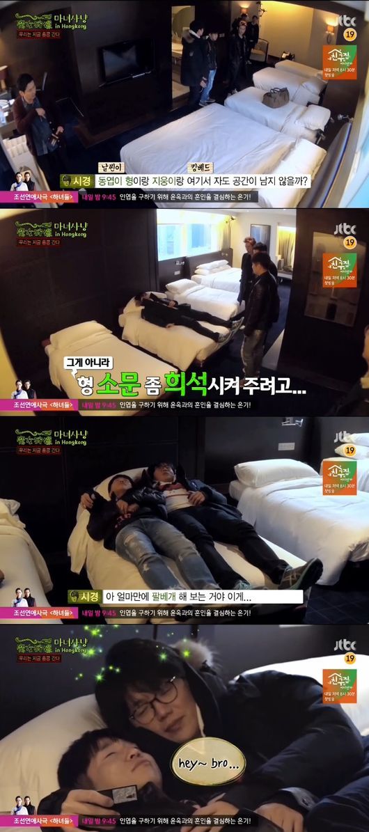 유세윤은 "형 소문 좀 희석시켜 주려고"라며 성시경 옆에 누웠고 성시경은 유세윤의 다리에 자신의 다리를 올려 묘한 자세를 취했다.