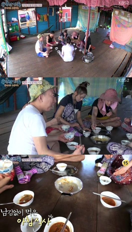 다음날 아침, 남자들은 빈 속에 고기잡이를 나갔고, 남자들이 돌아올 시간에 맞춰 여자들은 식사를 준비했다. 가족들은 둘러앉아 식사를 했고, 박명수는 코코넛 밀크를 넣은 매운탕에 "태국 음식 똠양꿍 맛이 난다"고 좋아했다. 하지만 밥과 국만 있는 식단에 "이러니 금방 배가 꺼지지. 소세지 없냐"고 말해 웃음을 유발했다. 이에 최정원은 "어린이 입맛이다"고 놀리기도 했다.
