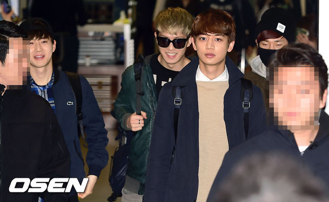 샤이니 민호, 엑소 수호, 씨엔블루 종현, 인피니트 성규가 입국장에 들어서고 있다.