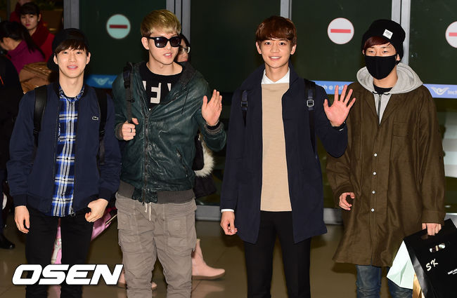 샤이니 민호, 엑소 수호, 씨엔블루 종현, 인피니트 성규가 입국장에 들어서고 있다.