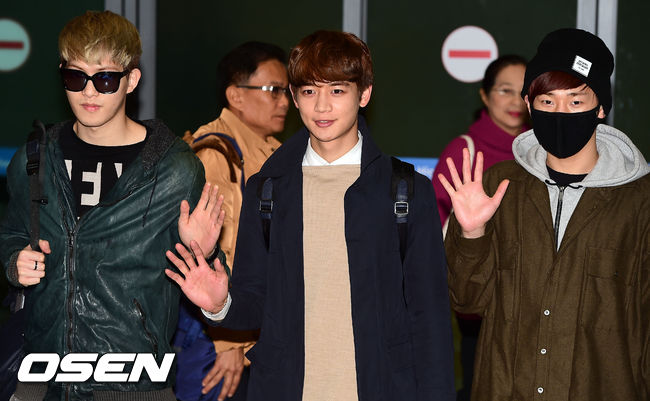 샤이니 민호, 엑소 수호, 씨엔블루 종현, 인피니트 성규가 입국장에 들어서고 있다.
