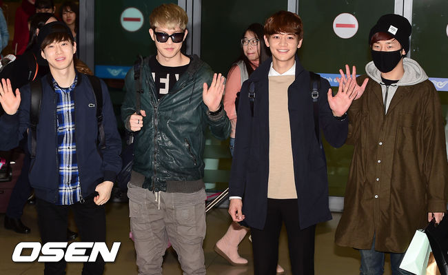샤이니 민호, 엑소 수호, 씨엔블루 종현, 인피니트 성규가 입국장에 들어서고 있다.