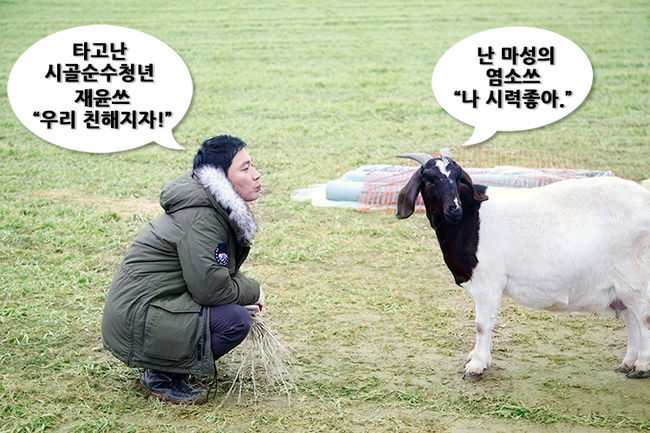 사진 속에서 조재윤은 염소와 친해지기 위해 자세를 낮추고 키스를 부르는 입술을 내밀고 있다. 하지만 시선을 피하는 염소를 보며 한 없이 작아지는 조재윤의 모습이 보는 이들의 웃음을 자아내고 있다.