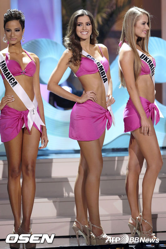 미스 자메이카, 콜롬비아, 우크라이나 참가자가 수영복을 입고 멋진 워킹을 하고 있다.