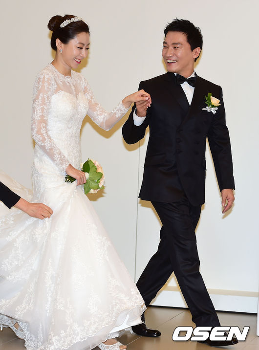 결혼식에 앞서 갖은 기자회견에서 조재윤이 신부와 함께 포토월로 입장하고 있다.