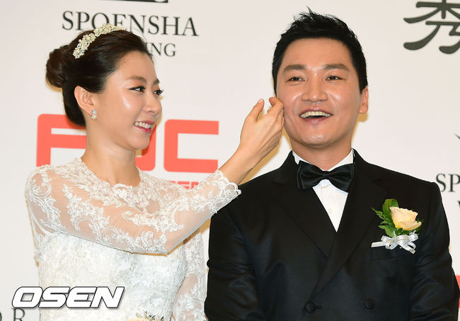 결혼식에 앞서 갖은 기자회견에서 신부가 조재윤 볼에 묻은 립스틱을 닦고 있다.