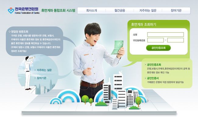 이 사이트로 들어가서 이름과 주민등록번호, 그리고 공인인증서로 본인 확인을 하면 은행이나 보험, 우체국 등에 있는 각종 휴면 계좌를 한꺼번에 조회할 수 있다. 계좌를 조회한 뒤 해당 은행에 가서 다른 계좌와 마찬가지로 반환 요구를 하면 된다.