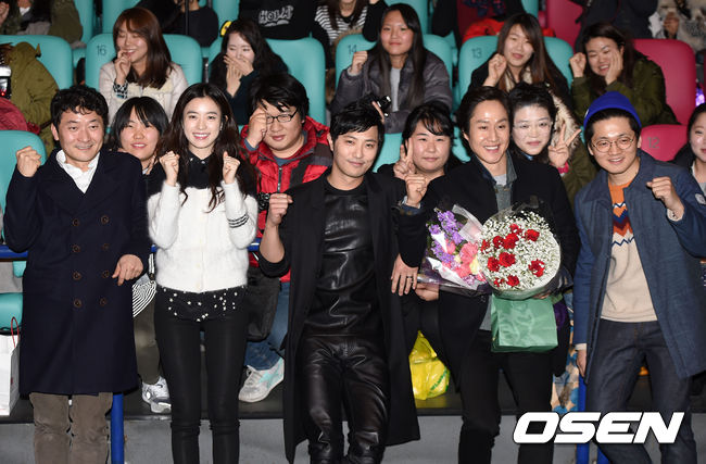 김현석 감독, 배우 한효주, 진구, 정우, 조복래가 관객들과 기념촬영을 하고 있다.