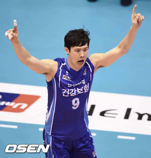 7일 오후 충남 아산시 이순신실내체육관서 열린 NH농협 2014-2015 V-리그 남자부 우리카드와 삼성화재의 경기 2세트 삼성화재 이선규가 득점 후 기뻐하고 있다.