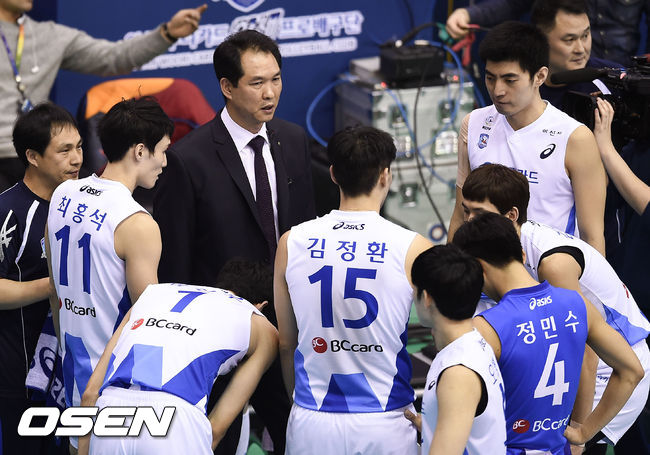 7일 오후 충남 아산시 이순신실내체육관서 열린 NH농협 2014-2015 V-리그 남자부 우리카드와 삼성화재의 경기 1세트를 아쉽게 놓친 우리카드 양진웅 감독대행이 선수들과 이야기를 나누고 있다.