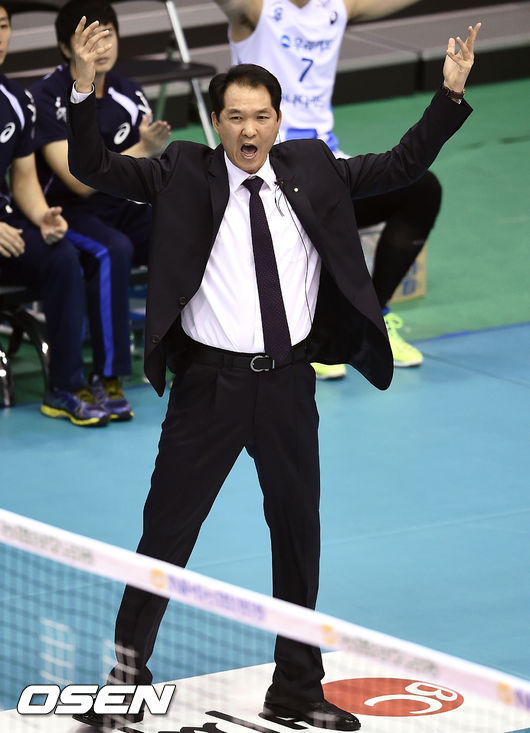 7일 오후 충남 아산시 이순신실내체육관서 열린 NH농협 2014-2015 V-리그 남자부 우리카드와 삼성화재의 경기 1세트 우리카드 양진웅 감독대행이 기뻐하고 있다.