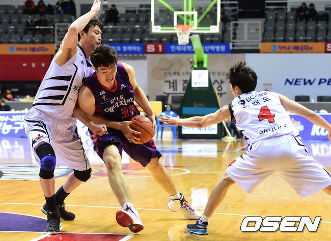 2쿼터, 오리온스 이승현이 KT 송영진과 이광재 수비를 뚫고 있다.