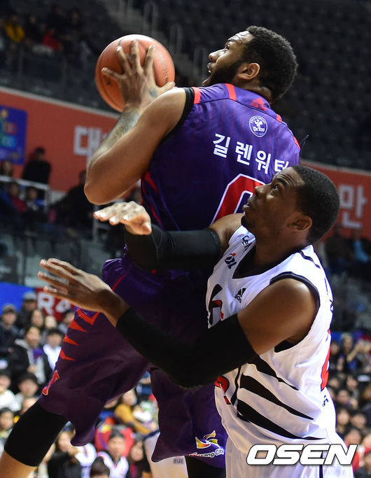 2쿼터, 오리온스 길렌워터가 KT 로드 수비를 피해 골밑슛을 시도하고 있다.