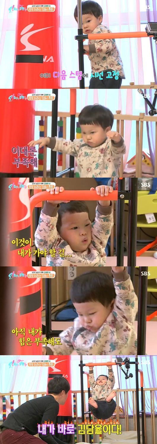 김담율은 7일 방송된 SBS 예능프로그램 ‘오 마이 베이비’에서 카메라가 설치된 장애물을 오르겠다고 힘을 썼다.