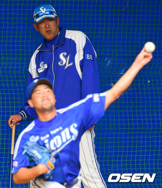 삼성 카도쿠라 코치가 장원삼의 불펜 투구를 지켜보고 있다.