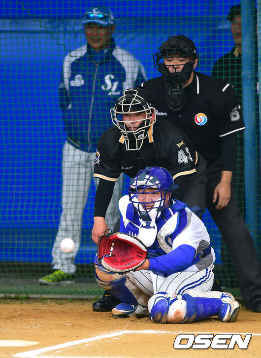 KBO 심판진들이 오키나와 삼성 스프링캠프를 찾아 불펜 투구 중인 투수들의 볼을 보며 콜을 하고 있다.