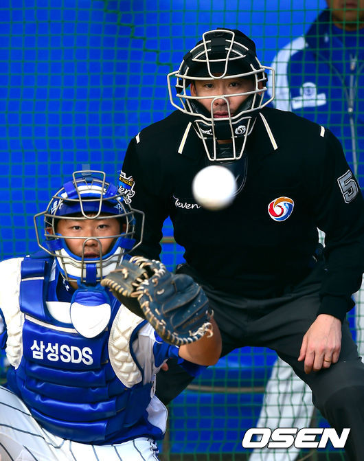 KBO 심판진들이 오키나와 삼성 스프링캠프를 찾아 불펜 투구 중인 투수들의 볼을 보며 콜을 하고 있다.