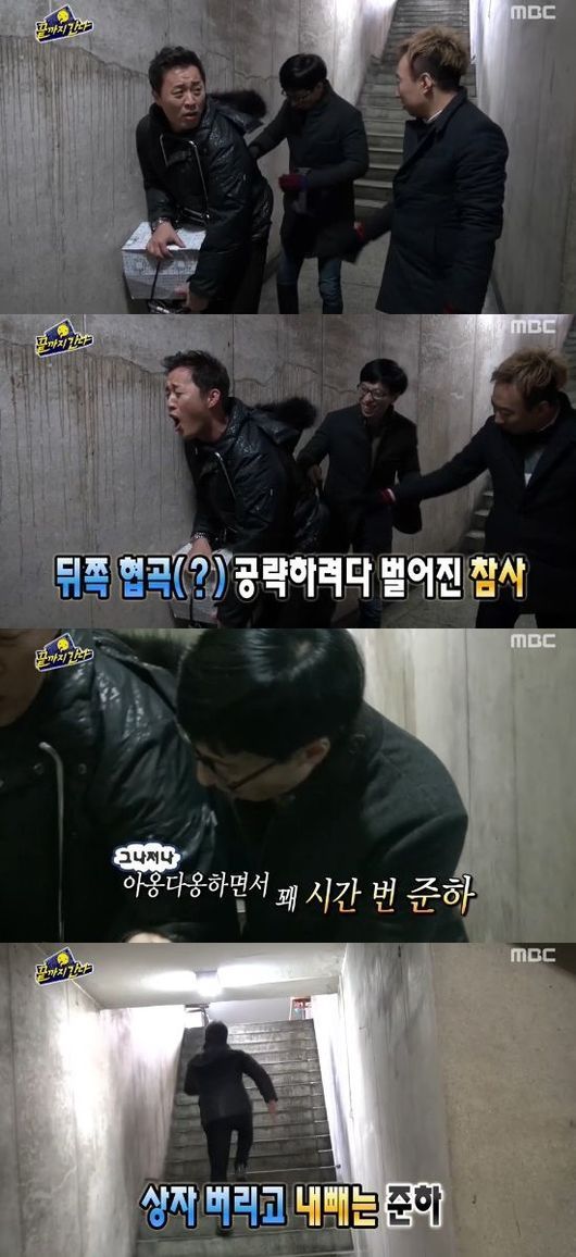 그렇게 두 사람의 밀고 당기기가 이어졌고, 결국 유재석은 정준하의 옷을 잡아당기던 중 팬티를 찢어버렸다.
