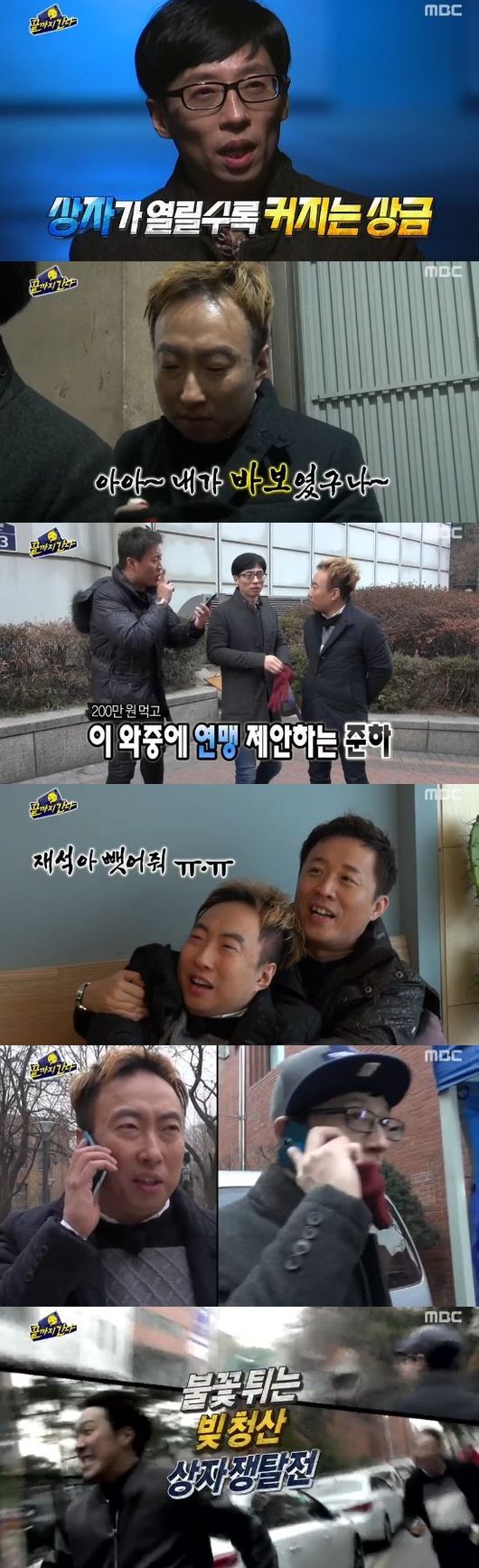7일 오후 방송된 MBC 예능프로그램 '무한도전'은 '끝까지 간다' 특집으로 꾸며졌다. '끝까지 간다'는 여러 겹으로 이루어져 있는 의문의 상자를 열 때마다 상금의 액수가 상승, 원하는 만큼 상자를 열어 상금을 획득할 수 있는 상자 쟁탈 추격전이다.