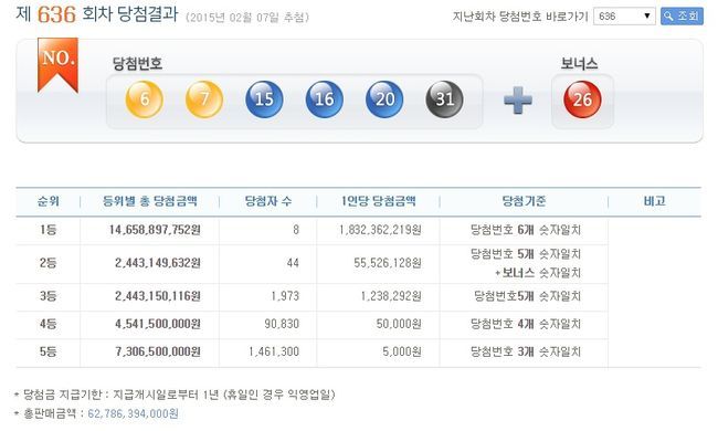 7일 나눔로또에 의하면 636회 로또 당첨번호가 6, 7, 15, 16, 20, 31으로 정해졌다. 636회로또당첨번호 중 보너스 번호는 26이다.