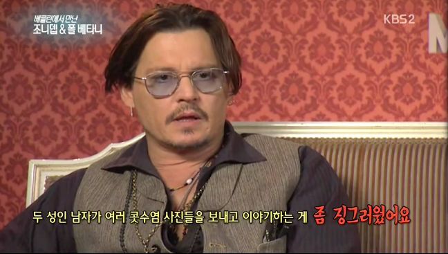 조니 뎁은 7일 오후 방송된 KBS 2TV '연예가중계'에서 영화 속 수염이 진쨔냐는 물음에 대해 "붙인 거다"고 답했다.