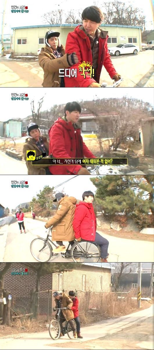 은지원은 7일 오후 방송된 KBS 2TV 예능프로그램 '인간의 조건2'에서 함께 동내 개천에서 물을 구하기 위해 자전거를 타고 집을 나섰다.