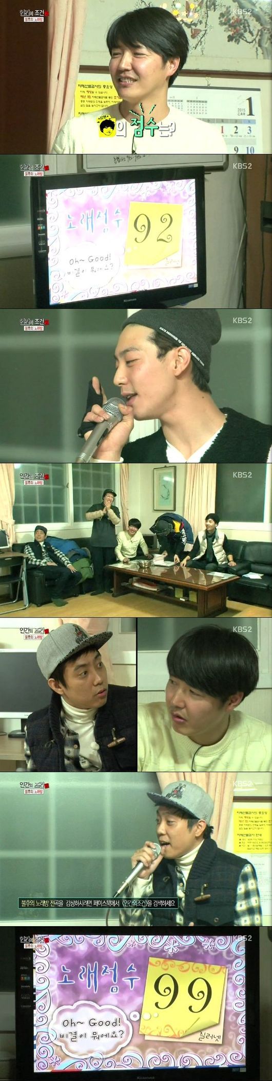 윤상현은 7일 오후 방송된 KBS 2TV 예능프로그램 '인간의 조건2'에서 마을 회관에 설치된 노래방 기계로 노래를 불러 각각 92점, 79점이라는 낮은 점수를 받았다.