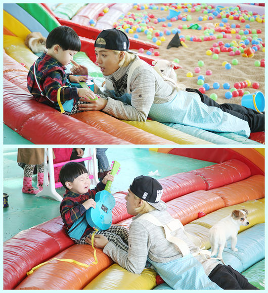 공개된 사진 속에서 온유는 장난감 기타를 조율하고 있으며, 강남은 그 앞에서 따뜻한 모습으로 온유와 놀아주고 있다. 또한, 울음을 터뜨린 온유와 그 앞에서 온유를 달래며 걱정하는 모습의 강남은 마치 친형제처럼 다정한 모습이다.