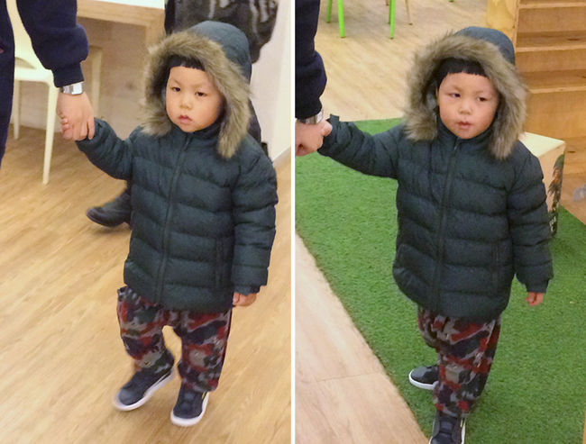 사진 속 윤석은 바가지 모양 헤어스타일에 패딩을 입고 있다. 통통한 체형을 돋보이게 하는 바지가 귀여운 매력을 더했다.
