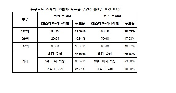 최종 KB스타즈 60점대-하나외환 50점대 18.21%로 최다 집계…9일(월) 오후 6시 50분 마감