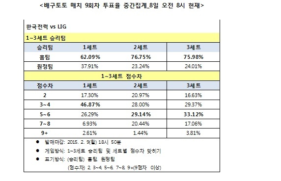 국민체육진흥공단(www.kspo.or.kr)이 발행하는 체육진흥투표권 수탁사업자 공식 인터넷 발매사이트 베트맨(www.betman.co.kr)은 오는 9일(월)에 수원실내체육관에서 열리는 2014-2015시즌 V-리그 한국전력-LIG전을 대상으로 하는 배구토토 매치 9회차 게임 투표율 중간집계 결과, 배구팬들은 한국전력이 LIG를 상대로 우세한 경기를 펼칠 것으로 예상했다.