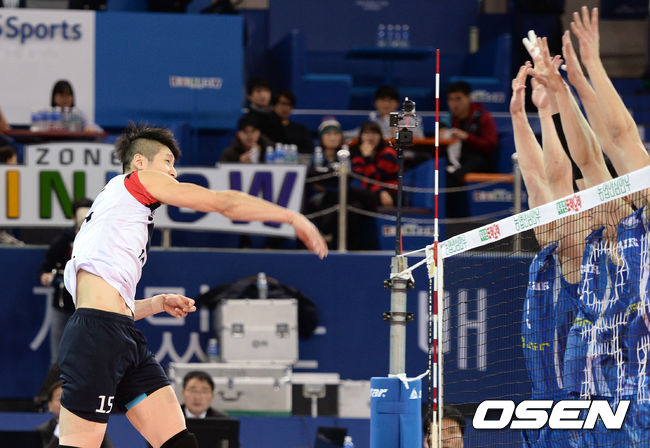 2세트 현대캐피탈 문성민이 대한항공의 블로킹 벽을 피해 공격을 시도하고 있다.