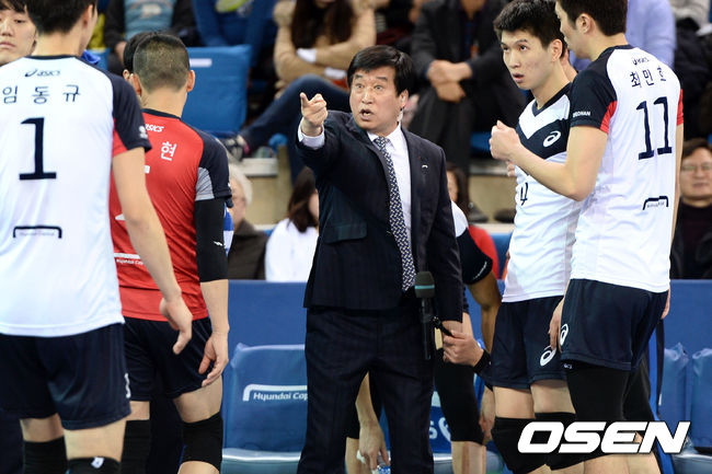 2세트 작전타임때 현대캐피탈 김호철 감독이 작전을 지시하고 있다.