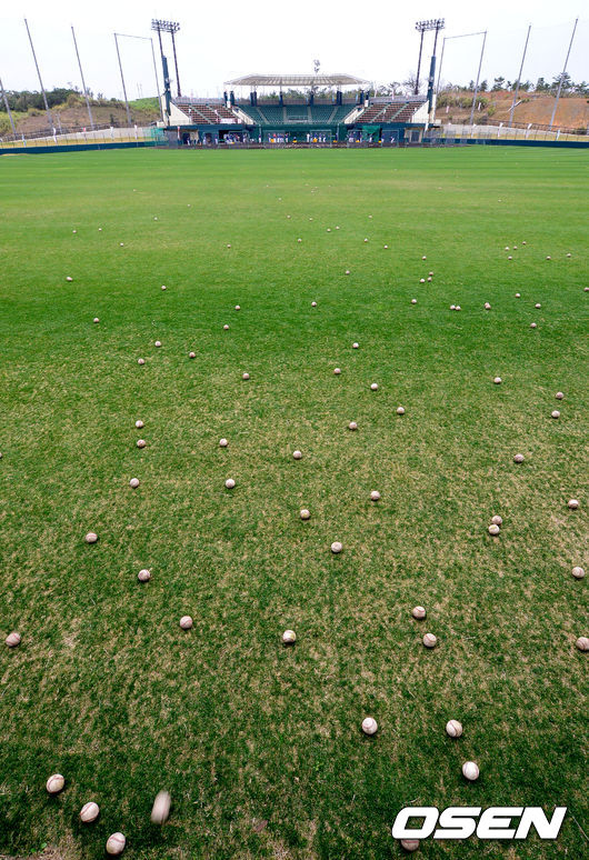 KIA 타자들의 타격 훈련 때 공이 외야 펜스 근처에 쌓이고 있다.