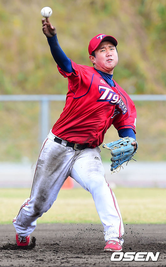 KIA 황대인이 수비 훈련을 하고 있다.
