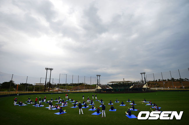 잔뜩 찌뿌린 오키나와의 날씨 속에서 KIA 선수들이 스트레칭을 하고 있다.